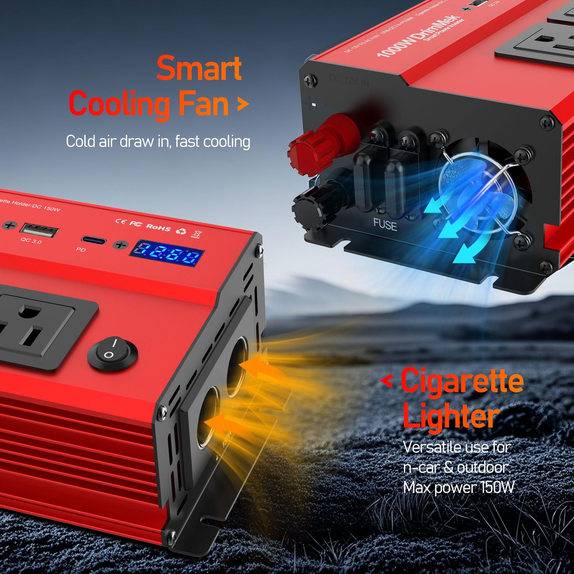 - 【Power - Packed Performance】: DrimMek 1000w power inverter delivers a stable 1000W of continuous DC - to - AC power, car inverter 12V to 110V.With 2 110V AC outlets, a USB port featuring QC3.0, PD, and 2.4A output, dual 12V Car cigarette lighter inverter and 2 spare 40A Fuses. The intelligent display can automatically detect car temperature, battery power, USB voltage, current