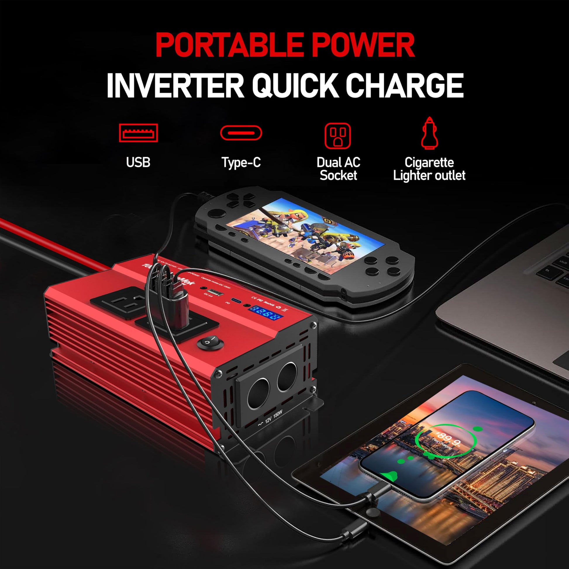 - 【Camping and Outdoor Activities】In the wild environment where there is no access to traditional power sources, the car inverter can be connected to the vehicle's cigarette lighter adapter. It is equipped with 4 output ports and can supply power to devices such as lights, fans, and small kitchen appliances. This 12V to 110V inverter is a must-have item for road trips or camping.